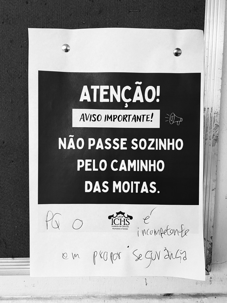 Na imagem do início desse texto, a frase em destaque é: “ATENÇÃO! Aviso importante! Não passe sozinho pelo caminho das Moitas.”. O caminho é o que liga o campus ICHS até a moradia estudantil, popularmente chamada de “Moitas”. Mas, para quem é esse alerta? Ele se diz universal, direcionado a todos aqueles que realizam esse caminho, mas tem um recorte muito específico: as mulheres que passam por ali. E esse é um dos pontos principais que liga meu relato com o da UFOP: somos avisadas, impedidas e aconselhadas por pessoas próximas a não realizar mais os mesmos caminhos, aqueles em que sofremos assédio.
