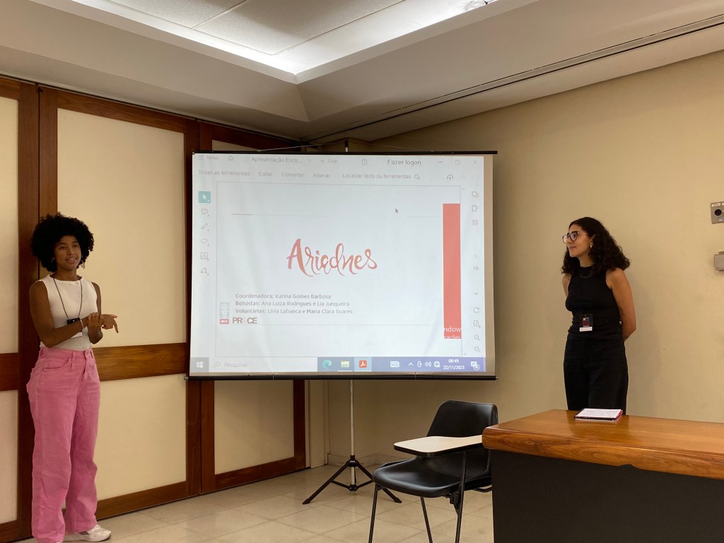 Na Mostra PIDIC, Ana Luiza Rodrigues e eu, Lia Junqueira – bolsistas – apresentamos o Projeto Ariadnes e alguns de nossos resultados, discutindo, através da perspectiva de gênero, sobre outras formas de observar o mundo e a mídia. Além disso, trouxemos exemplos de filmes e séries que já analisamos aqui no site, assim como a coleta de relatos, que dão forma às nossas ações.