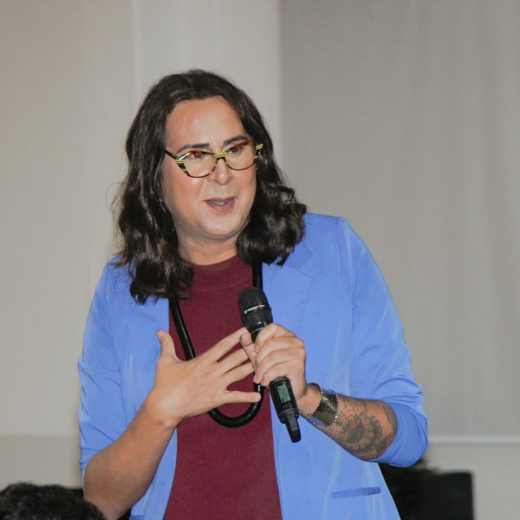 Duda começou a aula falando de suas vivências pessoais e profissionais. Disse que ser uma mulher trans perpassa sua trajetória e por isso ela enfatiza dados e informações sobre a situação de travestis e transsexuais no Brasil. Ela conta que essas pessoas não são vistas como humanas e não têm direitos básicos, como banheiros, nome e identidade. Por isso, ela luta por esse grupo.