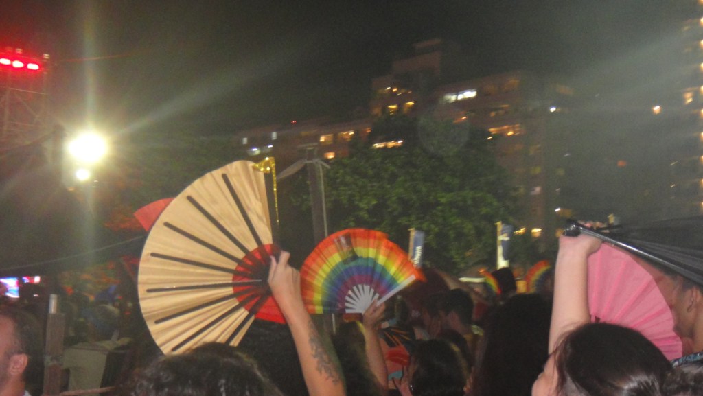 Com o bater dos leques, looks extravagantes (maravilhosos) e bandeiras com as cores de arco-íris era possível identificar que estávamos em meio a muitas, muitas pessoas LGBTQIAPN+ (arrisco dizer que um dos maiores encontros, perdendo apenas para a Parada de São Paulo, que, inclusive, está próxima). Nós, também, como membros dessa comunidade colorida e brilhante, nos misturamos em meio ao calor que envolvia os corpos ali presentes.