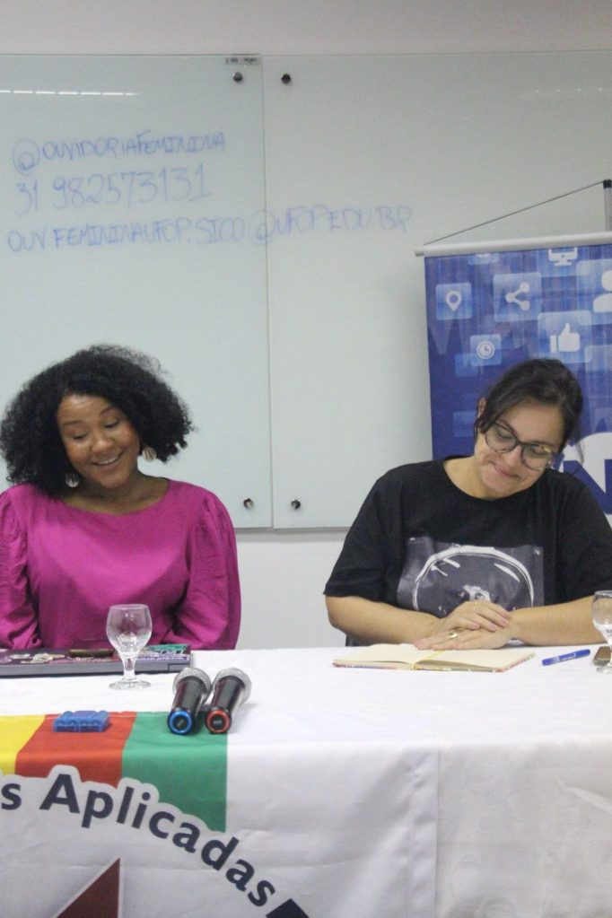 Idealizada pelos estudantes do curso de Serviço Social da UFOP Isabela Werneck, Aline Martins e Douglas Henrique, a mesa de conversa contou com a presença da mestranda em Direito Laís Fonseca do Carmo, integrante do projeto Ouvidoria Feminina, do curso de Direito da UFOP; da estudante de Jornalismo da UFOP Ana Luiza Rodrigues, peça fundamental do coletivo Ariadnes; e da docente do curso de Jornalismo da Ufop Karina Gomes Barbosa, coordenadora do Ariadnes.