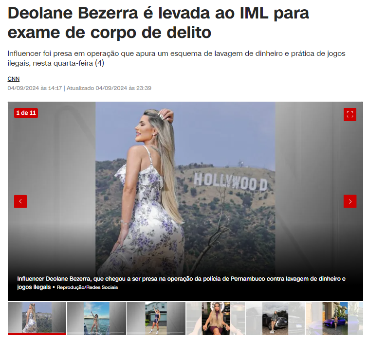 A primeira veiculação da CNN Brasil sobre o dia da prisão de Deolane Bezerra, 4 de setembro, foi publicada às 07h e seguiu de forma periódica posteriormente. Em geral, a cobertura da emissora destaca uma abordagem que prioriza a construção de uma narrativa informativa, mas ainda sensacionalista. Desde a primeira matéria, as escolhas das imagens utilizadas revelam uma estratégia de enquadramento que se apoia no reforço da apresentação de uma mulher sensual e provocativa. As fotos mostram a influenciadora bem arrumada com roupas femininas e provocativas, frequentemente em ambientes luxuosos, como salões de beleza e em uma lancha, o que reforça os estereótipos de feminilidade e superficialidade, que, muitas vezes, são atribuídos como características inerentes da personalidade da mulher.