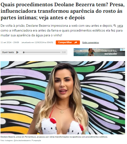 Nos jornais, Deolane não é só apresentada como uma figura que apresentava uma vida extremamente ostentativa, de luxos, que pode ter sido conquistada de forma ilícita. Ela é pautada e representada de forma estereotipada, sendo colocada para o público como a “ex-mulher do cantor Mc Kevin” e aquela que teve um “romance conturbado com Fiuk” – além das publicações de diversas notícias sobre seus procedimentos estéticos, suas relações com familiares, suas intrigas com outras mulheres e com seus antigos parceiros. As imagens atreladas a essas notícias são, muitas vezes, de Deolane usando biquínis, roupas curtas ou mostrando partes do seu corpo. Nas notícias veiculadas no dia 4 de setembro de 2024, Deolane Bezerra só existe se for atrelada à imagem de mulher descontrolada, a um par romântico ou à sexualização de seu corpo.