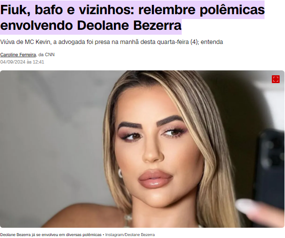 NETO, Francisco. Deolane Bezerra, presa no Recife, ganhou notoriedade após morte de MC Kevin. Folha de S.Paulo, 04 set. 2024. Disponível em: https://www1.folha.uol.com.br/cotidiano/2024/09/deolane-bezerra-presa-no-recife-ganhou-notoriedade-apos-morte-de-mc-kevin.shtml. Acesso em: 04 out. 2024.