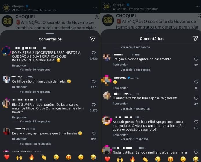 Nesse caso de Itumbiara, a Choquei explorou detalhes do caso e expôs a vida íntima. Em meio aos posts sobre o crime, havia uma publicação com imagens feitas por detetive particular no momento em que a esposa estava com um homem. Como em postagens anteriores a mulher já estava sendo julgada nos comentários, a página viabiliza as críticas e, além disso, secundariza o assassinato das crianças, tirando-o do foco e ignorando o fato de o crime ter uma razão de gênero. A página ignora a dinâmica da violência vicária e foca nas ações da mulher, seja para tentar conferir uma justificativa para o crime, seja no que ela estava fazendo no momento, como a ida ao velório das crianças. Assim, o debate passa a ser o comportamento da sobrevivente.