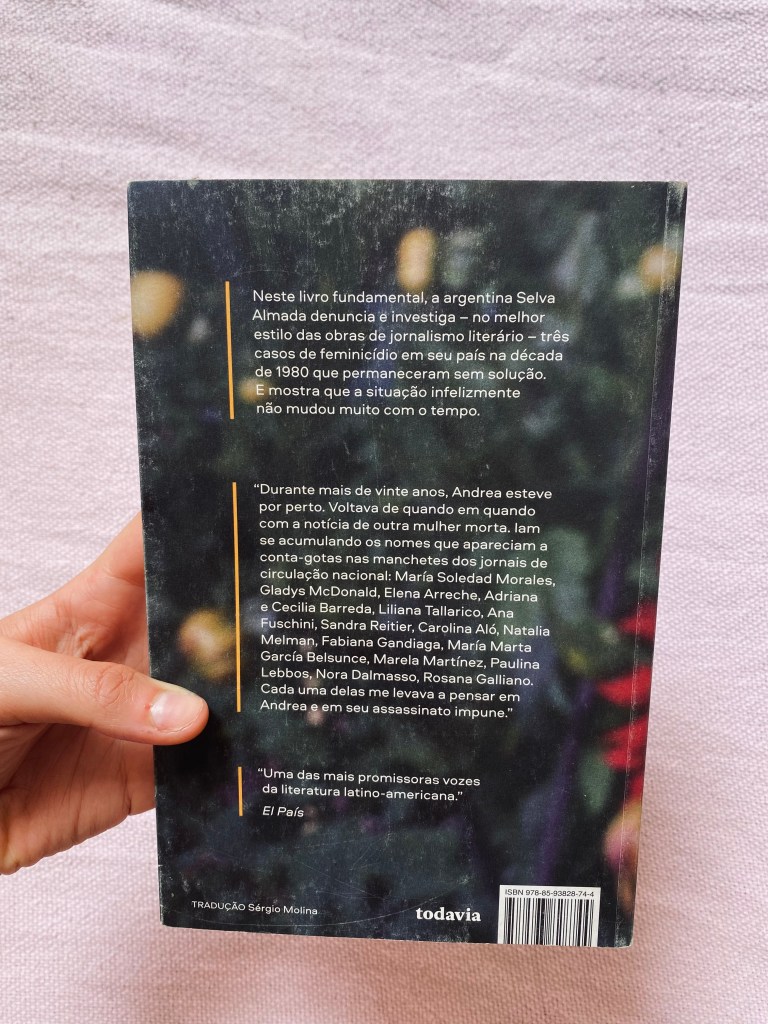 Capa e contracapa do livro. Fotos: Lia Junqueira A perspectiva de gênero, adotada pela escritora argentina, faz exatamente esse movimento de não só escutar outras mulheres com responsabilidade e vontade de entender aqueles homicídios sem respostas, mas ver semelhança entre eles e conseguir colocá-los como um problema inteiro e não só das cidades de San José, Presidencia Roque Sáenz Peña ou Villa Nueva.